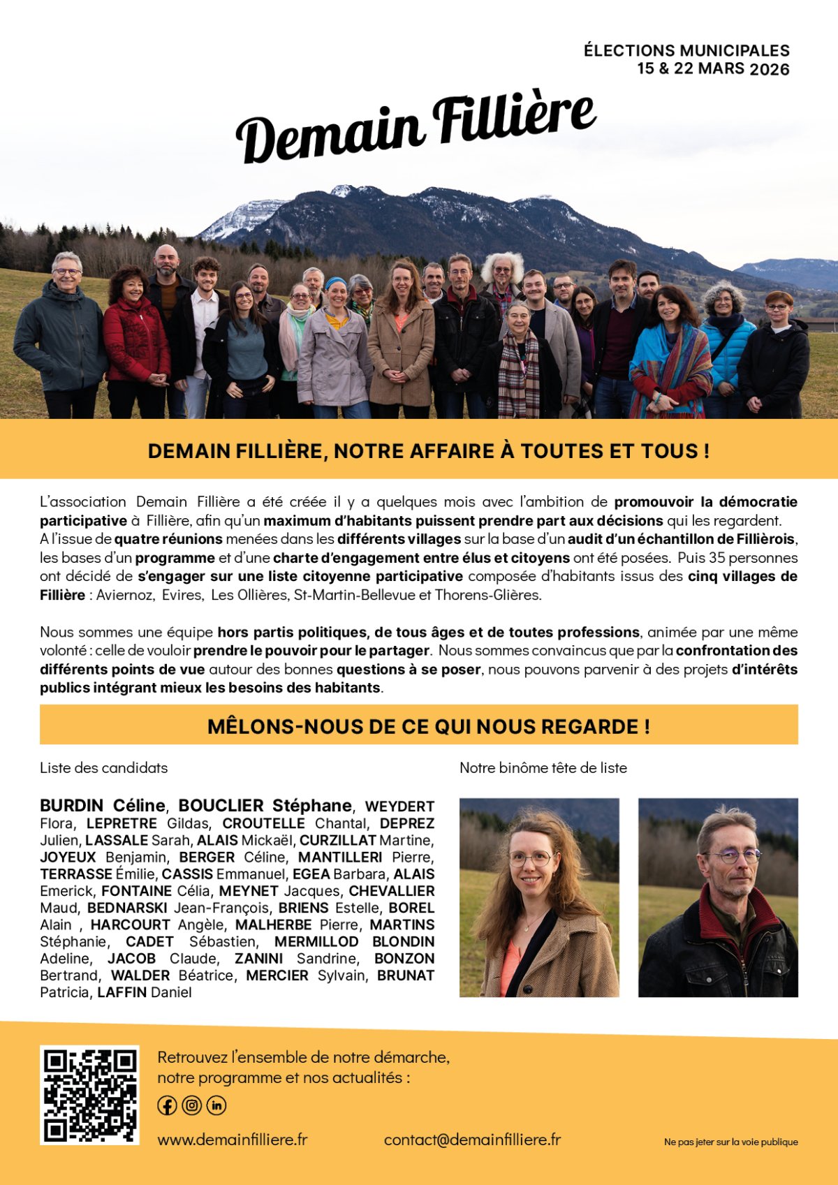 Demain Fillière souhaite préparer et donner les moyens aux Fillièrois et Fillièroises de lancer une liste citoyenne et participative, pour répondre au besoin de prendre des décisions avec des habitants de tous les villages.